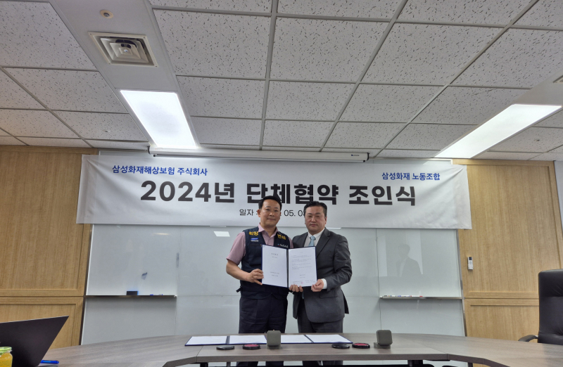 삼성화재 노사는 8일 오전 서울 중구 소재 더익스체인지서울 회의실에서 '2024년 단체협약 조인식'을 진행했다.