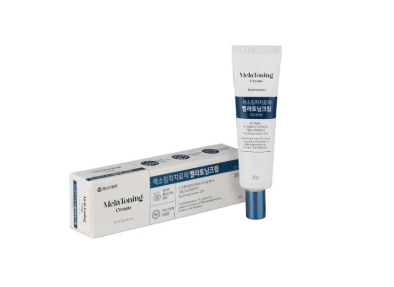 동아제약의 멜라토닝크림(이 약 1g 중 히드로퀴논 20mg 함유)은 멜라닌 색소 생성을 억제함으로써, 과다 침착 된 색소를 탈색해주는 색소침착치료제다. 히드로퀴논 성분 20mg 함유로 함량이 낮아 히드로퀴논 성분을 처음 사용하거나 피부가 민감한 분들에게 추천한다.