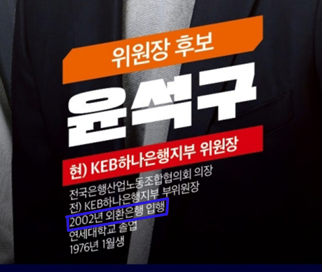 윤 위원장은 25일 본보와 통화에서 2002년 당시 입사한 회사명을 묻는 질문에 "외환카드"라고 밝혔다. 이는 이번 금융노조 위원장 선거 포스터에 적힌 '2002년 외환은행 입행'과는 일치하지 않는 답변이다. 그가 허위 프로필을 기재한 것일까?