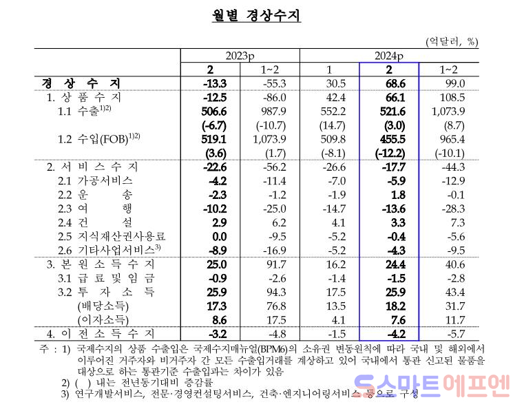 지적재산권수지(-4000만달러)도 특허·상표권 사용료 수입이 늘어나면서 1월(-5억2000만달러)보다 적자 폭이 감소했다. 운송수지는 운송 지급이 줄어 1억9000만달러 적자에서 1억8000만달러 흑자로 돌아섰다.