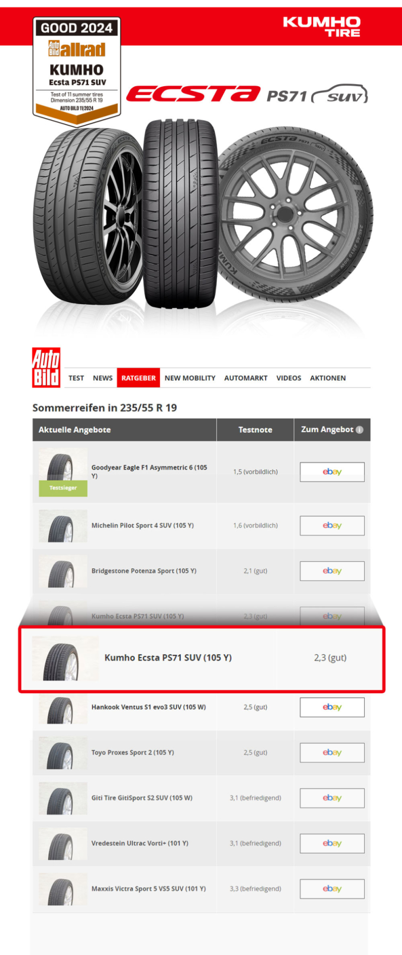 아우토빌트 알라드는 유럽 지역에서 판매 중인 주요 브랜드의 SUV 여름용 11개 제품(규격 235/55R19)을 대상으로 젖은/마른 노면 등의 타이어 접지력, 제동거리 및 주행 안정성 등 총 15개 항목에 대한 성능을 시험해 최종 순위를 가렸다. 그 결과 금호타이어의 ‘엑스타 PS71 suv’가 노면을 가리지 않는 안전한 핸들링, 짧은 제동거리 등 호평을 받으며 종합 4위를 차지하였다.