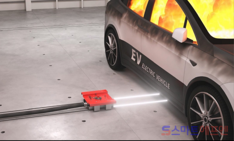 이번 건물용 전기차 화재진압 시스템은 기존 방식과 달리 전기차 하부 천공(穿孔) 후 배터리팩에 직접 물을 분사해 화재를 진압하는 차별화한 방식이다.