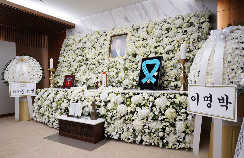 빈소에는 윤석열 대통령 명의의 조화, 고인과 사돈 관계인 이명박 전 대통령이 보낸 조화가 양쪽에 나란히 놓였다.