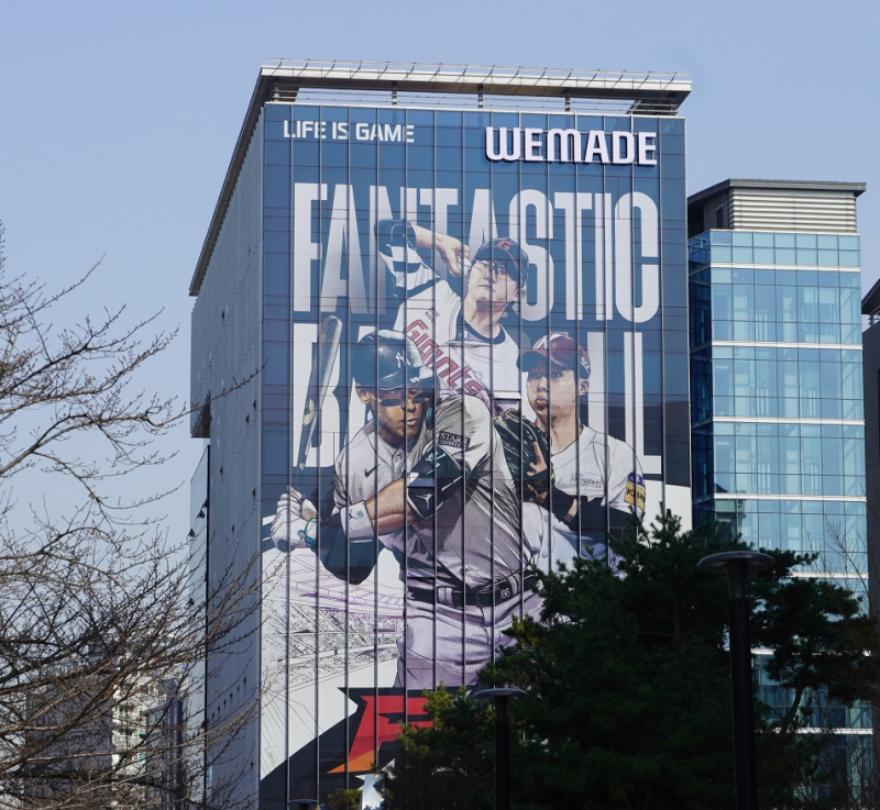 19일 업계에 따르면 위메이드는 자사 사옥에 ▲뉴욕 양키스 애런 저지 ▲롯데 자이언츠 박세웅 ▲키움 김혜성 선수가 그려진 판타스틱 베이스볼 관련 초대형 래핑을 선보였다.