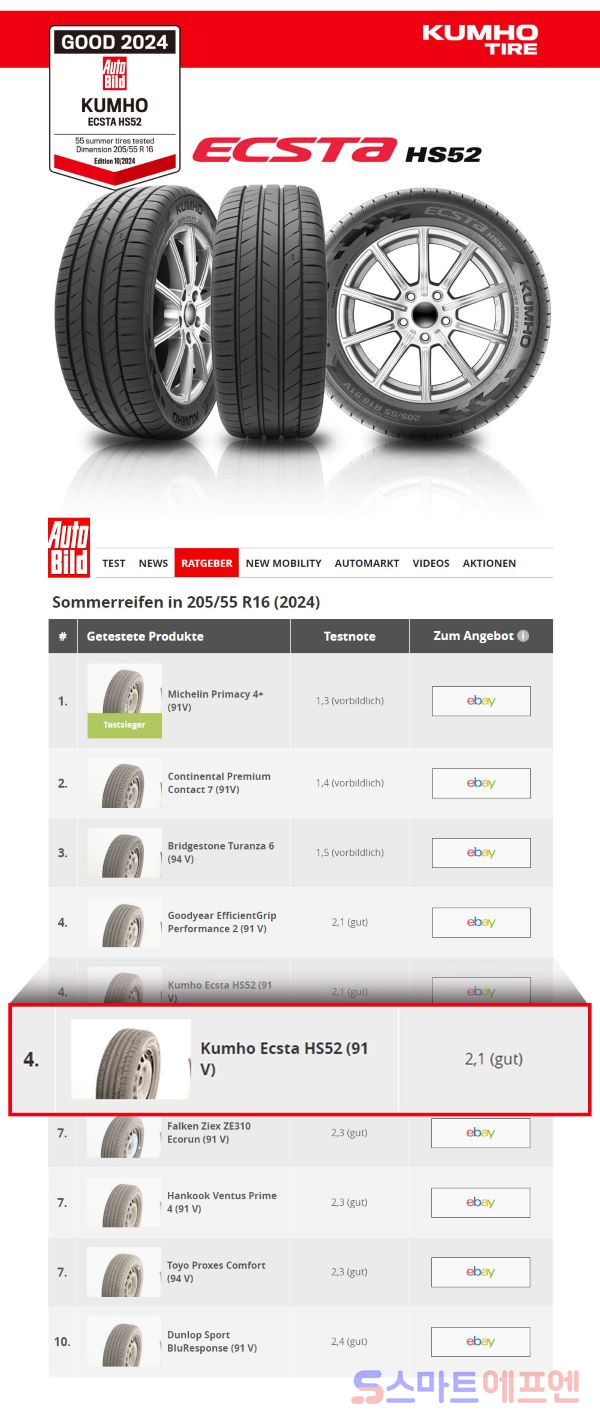 엑스타 HS52, ‘아우토빌트’ 여름용 타이어 성능 테스트 55개 제품 중 4위 차지