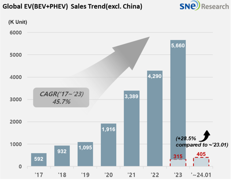 11일 에너지전문 시장 조사업체 SNE리서치에 따르면, 지난 1월 중국을 제외한 글로벌 각국에 등록된 전기차 등록 대수가 40만5000대로 전년 대비 28.5% 증가했다.