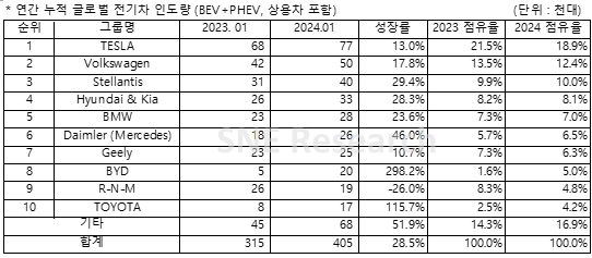 지난 1월 중국 제외 글로벌 시장 전기차 판매 대수를 살펴보면, 테슬라가 모델Y의 판매량에 힘입어 전년 동기 대비 10.3%의 성장세를 기록하면서 1위를 차지했다.