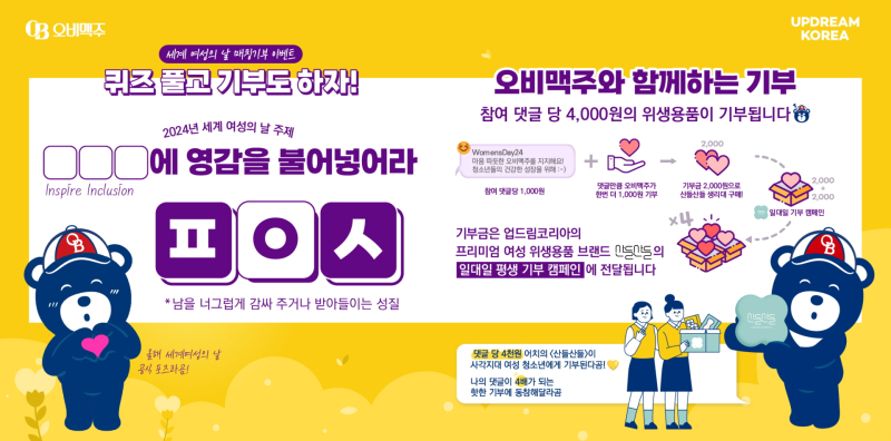 오비맥주는 2024 세계 여성의 날 조직위원회가 발표한 주제 ‘포용을 고취하라(Inspire Inclusion)’에 맞춰 포용성에 대한 대중의 인식과 관심을 높이기 위해 기부 캠페인을 기획했다.