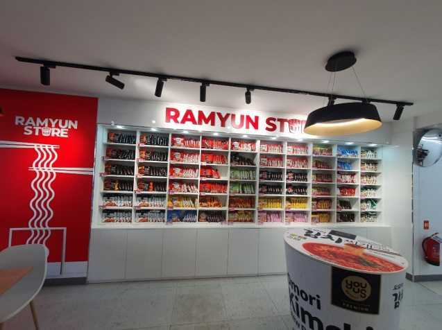 매장에서는 한국에서 인기 제품인 신라면과 불닭볶음면 외에도 GS25 자체제작(PB) 라면을 판매하며 라면 조리기, 전용 테이블 등을 배치해 라면 특화 매장으로 구성했다.