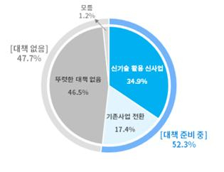 대책을 마련 중이라고 응답한 기업들이 가장 선호하는 전략은 ‘신기술을 활용한 신규 사업 모색’(34.9%)이었다. ‘기존 사업을 유망산업으로 대체 전환’이라는 응답한 기업은 17.4%였다. 기존 주력사업을 유지하면서 신기술을 접목해 보다 안정적으로 새로운 수익원을 확보하려는 기업들이 의 경향을 반영한 것이다.