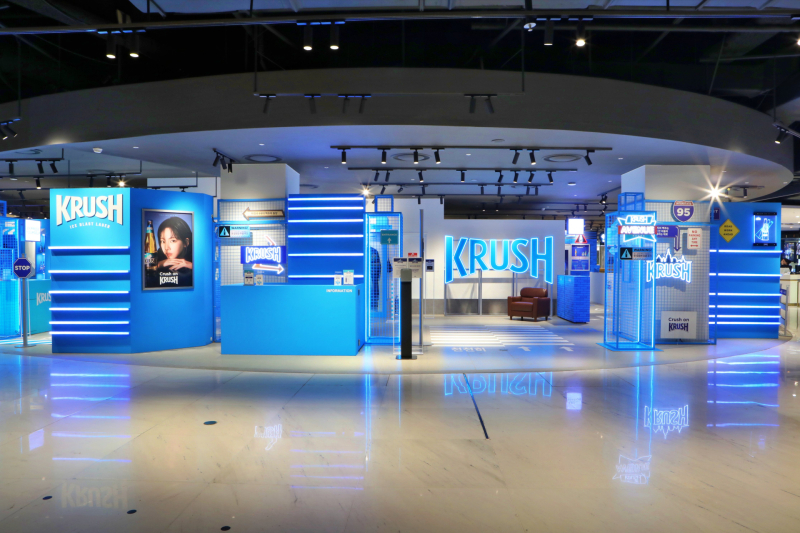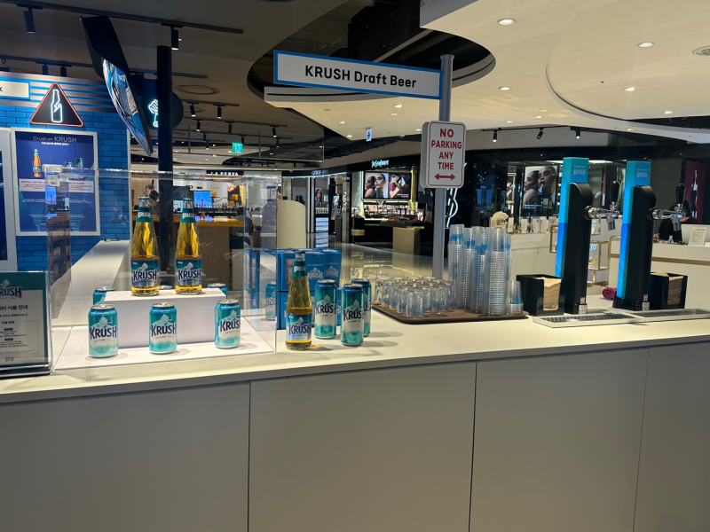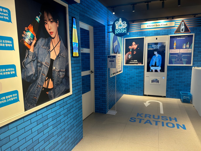 모든 공간은 크러시의 상징 색깔인 ‘라이트 블루’톤으로 도배돼 멀리서도 눈에 띄었다. 브랜드의 목적인 청량감을 내세운 듯 했다. 대단히 넓은 공간은 아니었지만 크러시 스탬프 랠리 여행을 콘셉트로 총 4가지 공간으로 꾸려져 오밀조밀 갖출 건 다 갖췄다.