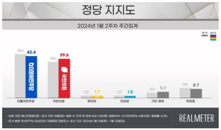 민주당과 국민의힘 지지율 격차는 7.9%p에서 2.8%p로 줄어들며 1주 만에 오차범위 내로 좁혀졌다.