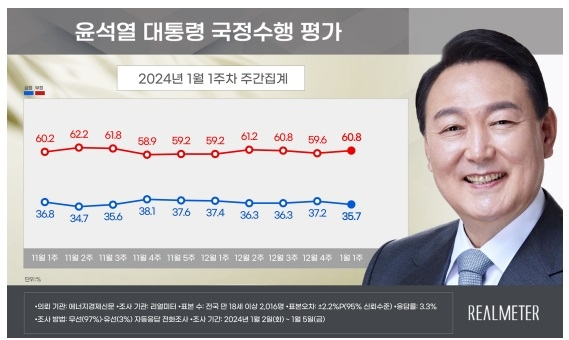 8일 여론조사 전문기관 리얼미터에 따르면 에너지경제신문 의뢰로 지난 2∼5일 전국 18세 이상 2016명을 대상으로 윤 대통령의 국정 수행 지지도를 조사한 결과 '긍정 평가'는 직전 조사(12월26~29일)보다 1.5%p 떨어진 35.7%로 집계됐다. 부정 평가는 1.2%p 상승한 60.8%였다.