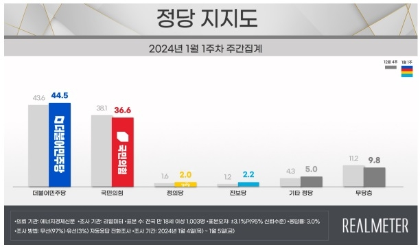 한편, 지난 4∼5일 전국 18세 이상 유권자 1003명을 대상으로 실시한 정당 지지도 조사에서는 국민의힘이 직전 조사(12월28~29일)보다 1.5%p 떨어진 36.6%, 더불어민주당은 0.9%p 오른 44.5%를 기록했다. 양당 격차는 5.5%p에서 7.9%p로 벌어졌다. 양당 지지율이 오차범위(±3.1%p) 밖의 격차를 보인 것은 3주 만이다.