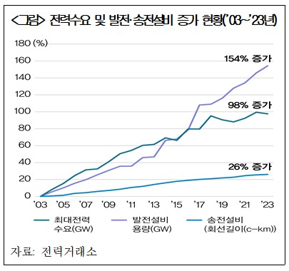 반면 송전 설비는 같은 기간 2만8260c-㎞(서킷 킬로미터·송전선로 길이의 단위)에서 3만5596c-㎞로 26% 증가하는 데 그쳤다.