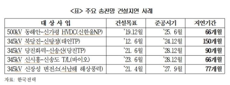 보고서는 최근 송전망 건설 사업이 평균적으로 5~6년 이상 지연되고 있다고 평가했다. 실제로 동해안과 수도권을 연결하는 동해안-신가평 500㎸(킬로볼트) 초고압 직류송전(HVDC) 건설 사업이 당초 계획보다 66개월 지연됐으며 북당진~신탕정 345㎸ 송전선로 사업은 150개월 미뤄졌다고 집계했다.