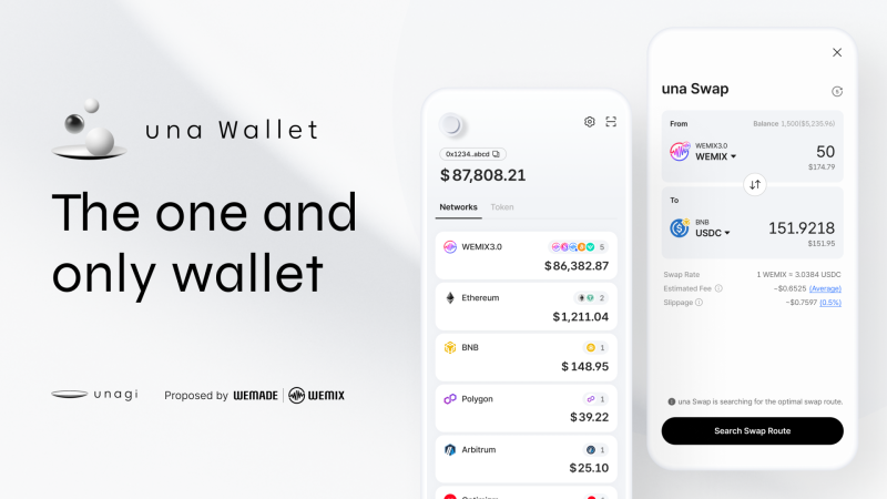 가상화폐 지갑 우나 월렛을 이용해 ▲위믹스3.0 ▲이더리움 ▲폴리곤 등 다양한 블록체인 상의 디지털 자산을 한 곳에 모아 관리하고 거래할 수 있다. 각 체인에서의 거래 내역과 다른 체인 간 자산 이동 내역 조회도 가능하다. 지원 체인은 계속해서 확대할 계획이다.