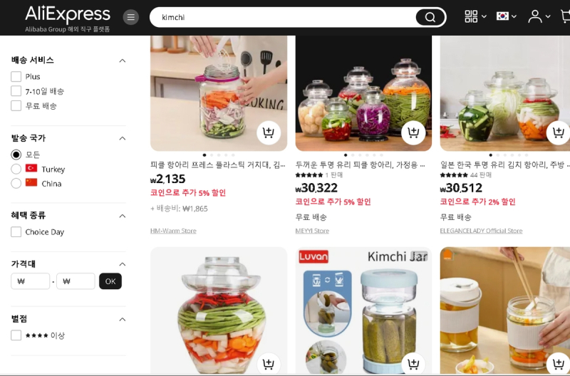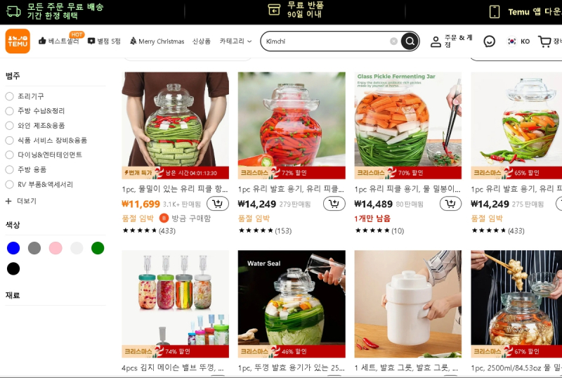 알리익스프레스 김치 검색화면. / 사진=사이트 캡쳐본 서 교수는 "이 쇼핑몰들에서 영어로 'Kimchi'와 한국어로 '김치'를 검색했을 때 '파오차이'를 담는 유리 항아리가 검색됐다"며 "특히 테무에서는 몇몇 업체가 '중국 전통 김치 항아리'라며 제품을 소개했다"고 설명했다.