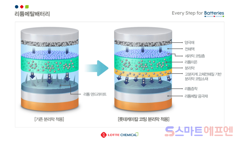 이번에 출원된 기술은 리튬이온의 흐름성을 개선하는 기능성 소재를 리튬메탈배터리 분리막에 코팅하여 덴드라이트(리튬에 바늘처럼 성장하는 현상, 전지의 활성을 저하시키는 가지모양의 결정) 현상을 억제함으로써 리튬메탈배터리의 내구성을 개선하는 것이 핵심이다.