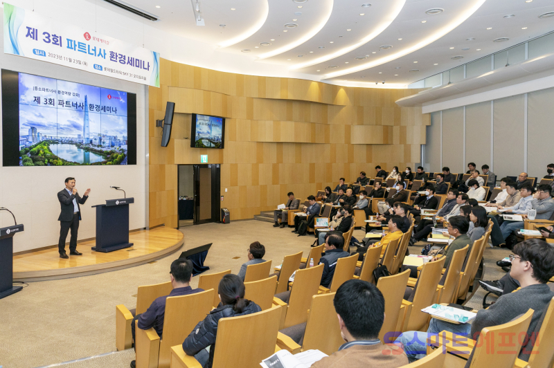이번 세미나는 중소 파트너사 100여개 업체가 참석한 가운데 ▲환경규제 강화 ▲공급망 관리 요구 강화 ▲재생에너지/자원선순환 대응 필요성 증대 등 환경 법규 동향을 점검하고 대응 전략을 모색할 수 있도록 마련됐다.