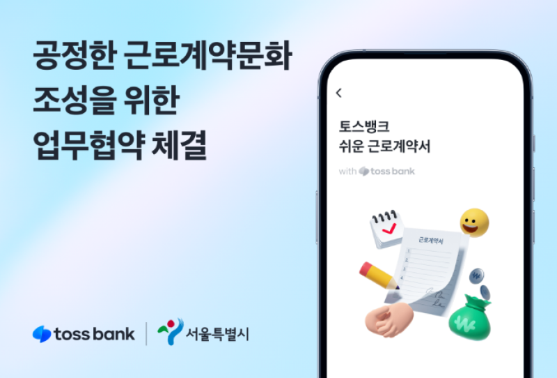 토스뱅크는 18일에 서울시와 '노동자의 권리보호 및 공정한 계약문화 조성을 위한 업무협약'을 체결했다고 밝혔다. 서울시가 표준계약서를 개발 후 보급하면 이를 토스뱅크의 쉬운 근로계약서에 담아 확산시킬 예정이다.
