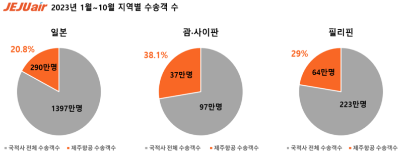 이 중 37만798명은 제주항공을 이용했다. 해당 노선에서 제주항공은 점유율 38.1%를 기록하며 경쟁력을 내비쳤다. 또한 필리핀 노선에서도 전체 223만3896명 중 29%인 64만6716명을 수송해 국적항공사 중 1위를 차지했다.