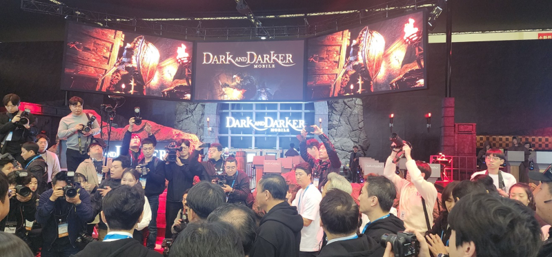 크래프톤과 스마일게이트는 각각 기대작으로 전시부스를 마련했다. 먼저, 크래프톤은 '다크앤다커' 지적재산권(IP)을 활용해 자체 제작한 '다크앤다커 모바일'의 시연부스를 마련했다.