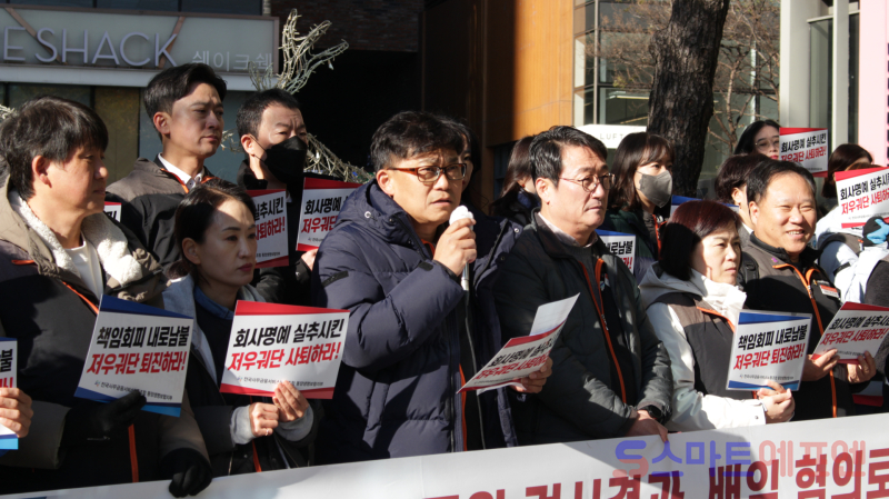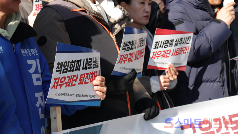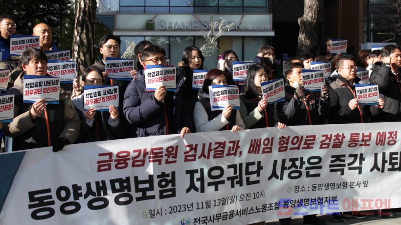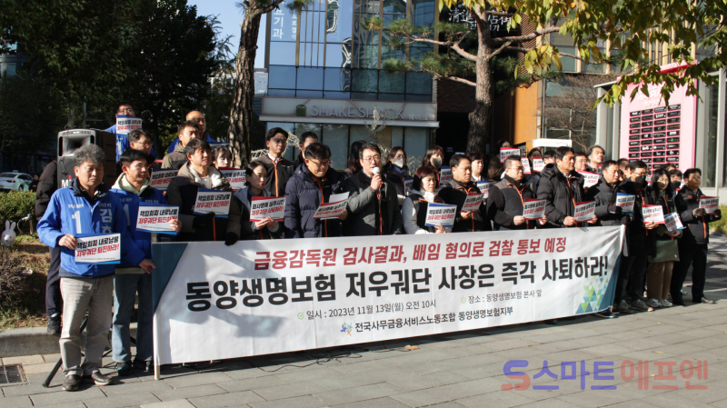 전국사무금융서비스노동조합 동양생명보험지부가 13일 오전 10시 동양생명 본사 앞에서 저우궈단 대표 퇴진을 촉구하고 있다. 글·사진=신수정 기자 newcrystal@smartfn.co.kr