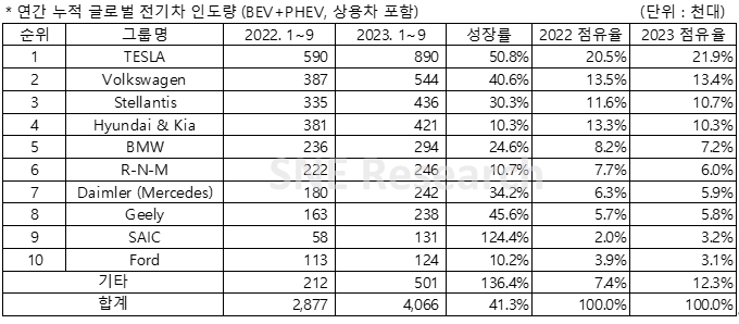 현대자동차그룹은 4위를 기록했다. 현대차그룹은 주력 차종인 아이오닉 5와 아이오닉6, EV6 외에 해외시장에서 높은 인기를 나타내는 투싼, 스포티지 플러그인 하이브리드 등 모델들의 판매량에 힘입어 전년 동기 대비 10.3%의 성장률을 기록했다. 올해 역대 3분기 최고 실적을 경신한 현대자동차그룹은 전용 전기차 브랜드 ‘아이오닉’의 글로벌 인지도 제고, 하이브리드 라인업 강화를 통한 친환경차 판매 확대를 통한 점유율 확대에 집중할 방침이라고 밝혔다.
