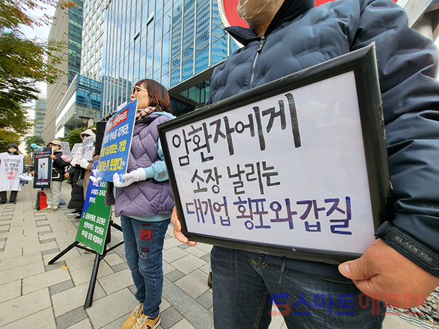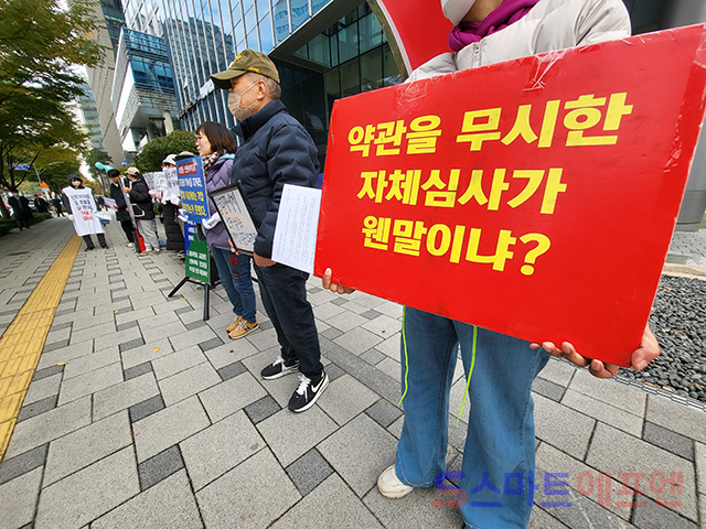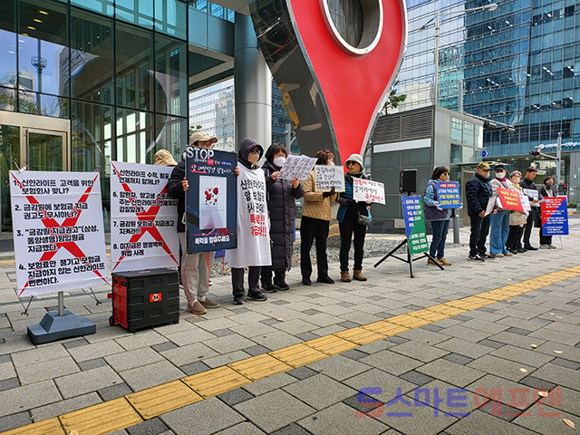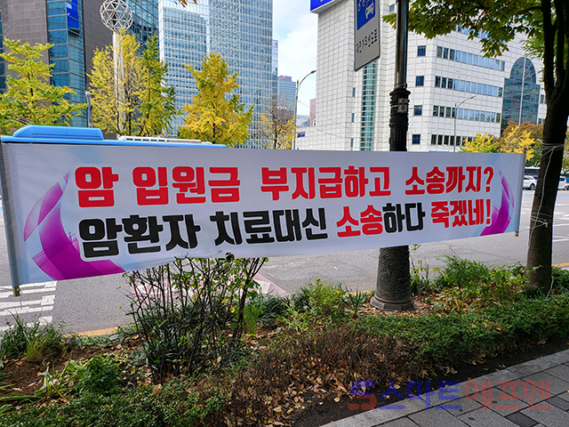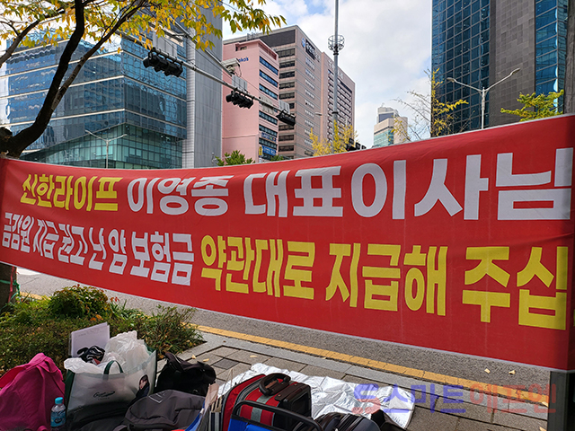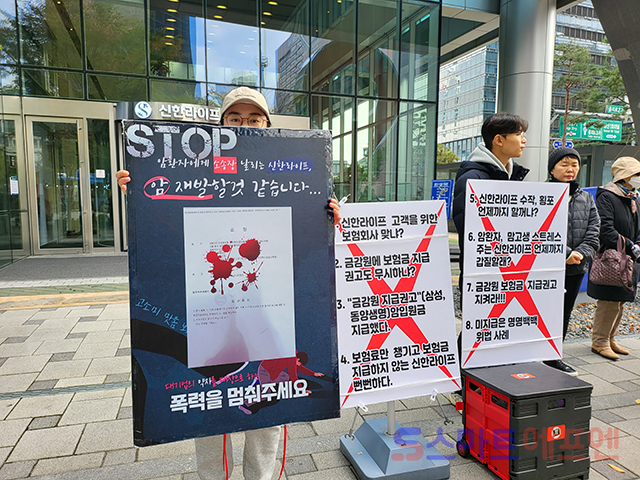 9일 오전 11시 서울 중구 을지로 소재 신한라이프 본사 앞에서 '신한라이프 암입원보험금 부지급 피해자 모임(신한 부피모)', '보험사에 대응하는 암환우 모임(보암모)' 관계자들이 기자회견을 열고 신한라이프의 암보험금 부지급 상황을 규탄하고 있다. 신한라이프 본사 주변에는 신한라이프가 암환자를 상대로 소송을 제기한 사실을 비판하고, 이영종 신한라이프 대표가 약관대로 보험금을 지급할 것을 촉구하는 현수막들이 걸려 있다.