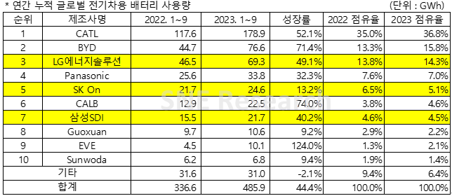 특히, 중국 내수 시장을 넘어 해외 진출에 본격적으로 뛰어든 CATL은 중국을 제외한 모든 대륙에서 전년 동기 대비 2배 가까이 성장했다. CATL의 배터리는 광저우자동차 아이온Y, 지리자동차 지커001과 같은 중국 내수 시장의 주력 승용 전기차 모델들 외에도 테슬라 Model 3/Y, BMW iX, 메르세데스-벤츠 EQS 등과 같이 전세계 주요 전기차 OEM의 차량에도 탑재되고 있어 꾸준히 높은 성장세를 이어갔다.