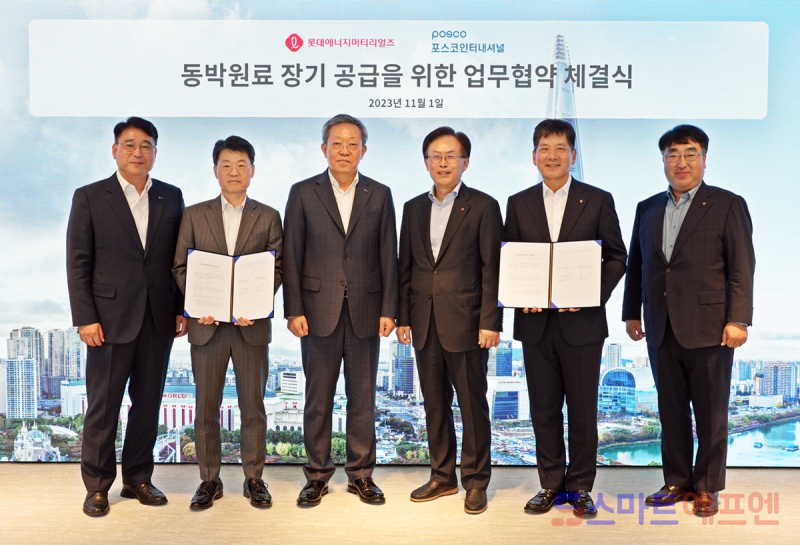 체결식에는 롯데케미칼 김교현 부회장, 롯데에너지머티리얼즈 김연섭 대표이사, 박인구 경영지원본부장, 포스코인터내셔널 정탁 부회장, 김병휘 친환경본부장, 유삼 친환경원료소재사업실장 등 양사 주요 임직원이 참석했다.