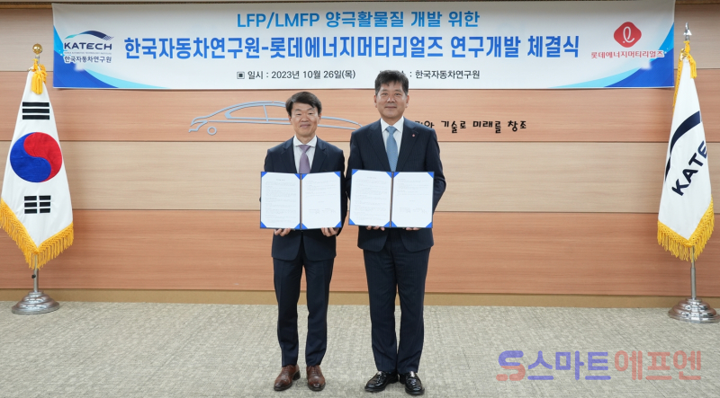 롯데에너지머티리얼즈는 한국자동차연구원과 26일 충남 천안시 풍세면에 위치한 한국자동차연구원 본원에서 고에너지밀도 리튬·인산·철(LFP) 배터리용 양극활물질 연구개발 계약 체결식을 진행했다고 26일 밝혔다.