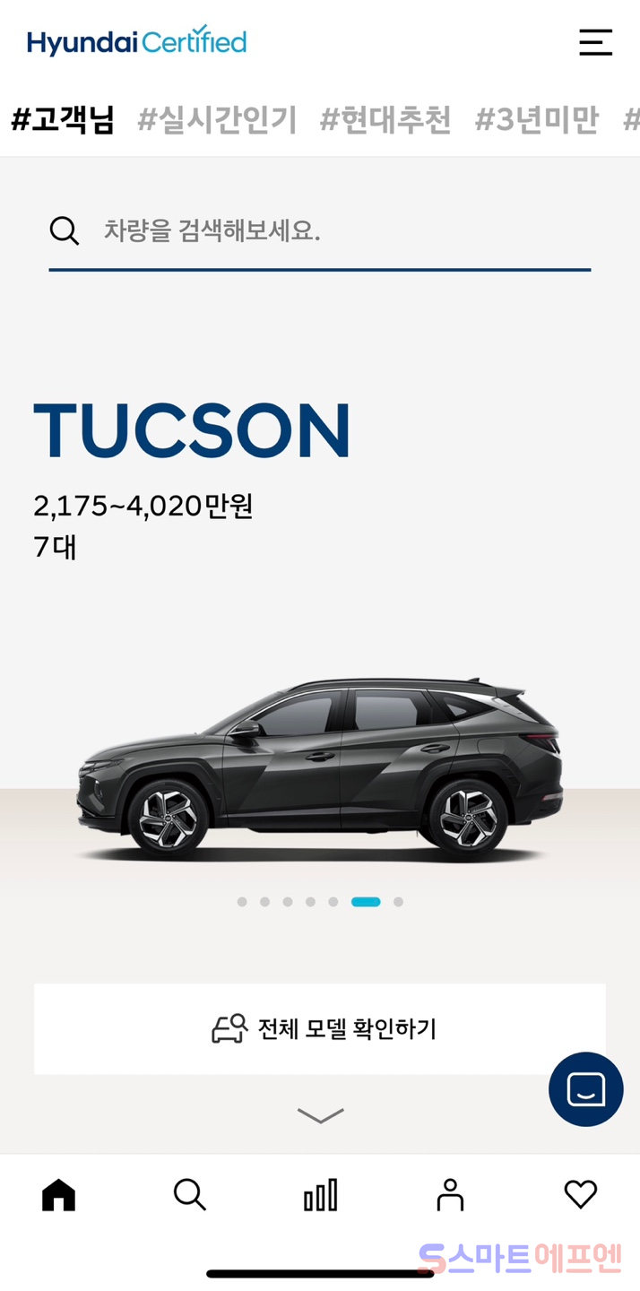 기본적으로 구매하고자 하는 모델을 검색할 수 있는 차량 검색란과 전체모델을 확인할 수 있는 항목들로 구성돼 있다. 또한 인증 중고차센터에 준비된 차량 수가 몇대인지도 실시간으로 정보를 제공하고 있다. 검색란 상단에는 연관 검색어 기능과 유사하게 사용자들이 가장 많이 검색한 단어(▲실시간 인기 ▲현대추천 ▲3년 미만 ▲사람들이 많이본 등)를 해시태그를 통해 제공하고 있었다.