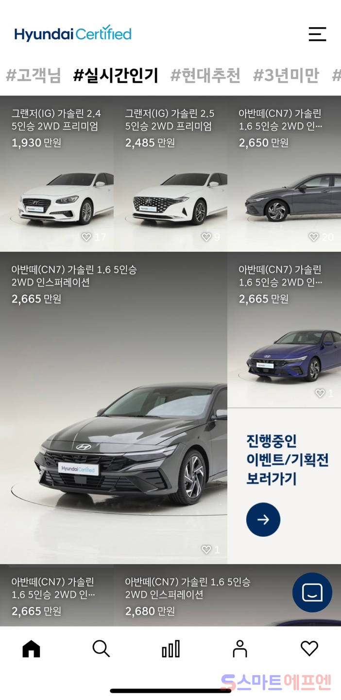 현대차가 서비스를 시작한 현대인증중고차 애플리케이션(앱)에 들어가 보면 첫 항목은 '내차 사기','내차 팔기'로 나눠지며 '내차 사기'를 선택해 들어갈 경우, 실시간으로 인기가 있는 차량들의 남은 재고와 가격, 제원등을 보기 쉽게 확인할 수 있다.