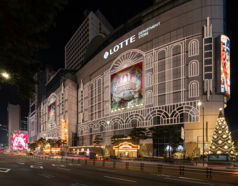 올해도 롯데백화점은 지난달 1일 부터 본점 크리스마스 장식에 불을 밝혔다. 특히 올해는 처음으로 약 2만여개의 LED를 활용한 외벽 라이팅 쇼를 진행하는 것이 특징이다. 본점 앞거리는 '씨어터 소공'으로 탈바꿈하고, 화려한 네온사인과 쇼윈도 등을 통해 1900년대 뮤지컬 극장가를 걷는 듯한 느낌을 담아냈다. 이 외에도 영플라자의 대형 미디어 파사드에서는 크리스마스 선물을 대표하는 화장품, 디저트, 주얼리, 와인 등이 주인공이 되어 백화점을 무대로 공연을 펼치는 영상을 선보인다.