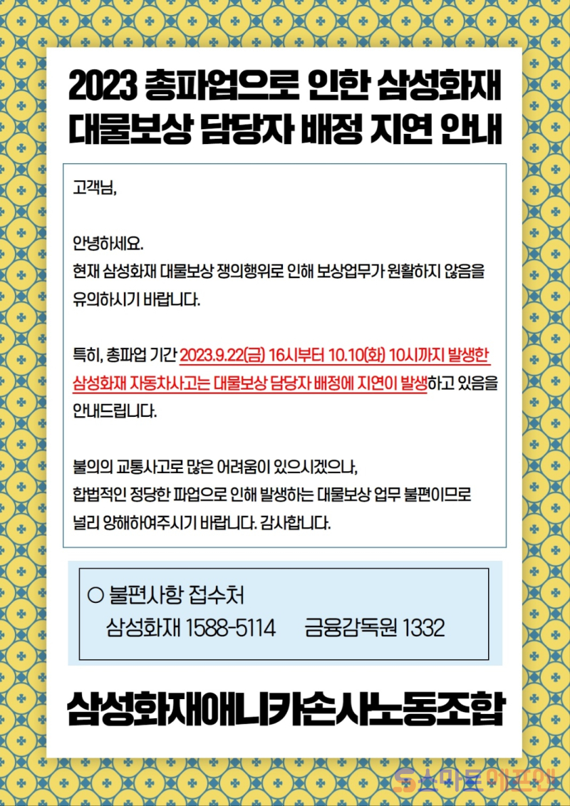 다만, 노조는 조합원에게 배당된 고객들에게 '2023 총파업으로 인한 삼성화재 대물보상 담당자 배정 지연 안내문'을 발송했다.