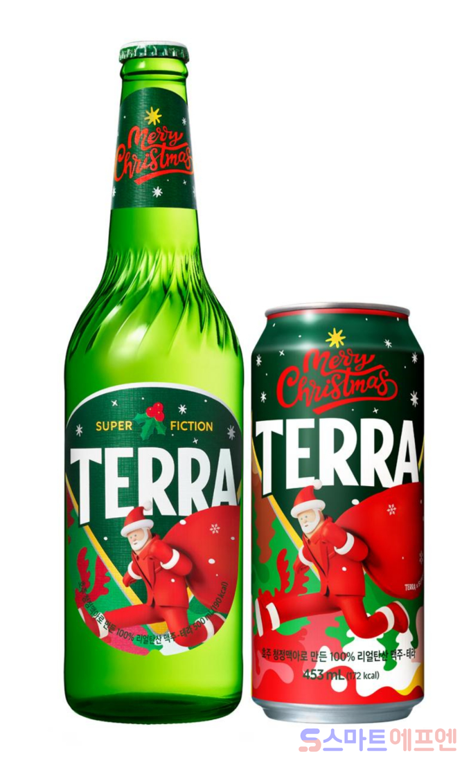 슈퍼픽션은 국내외 다수 기업화 협력하며 창의적인 디자인으로 주목받은 바 있다. 이번 테라의 크리스마스 에디션은 테라의 로고와 슈퍼픽션의 시그니처 캐릭터를 접목해 패키지를 새롭게 단장한다. 분주하게 달려오는 산타와 루돌프, 썰매 등의 요소로 즐겁고 유쾌한 크리스마스 분위기를 선보였다.