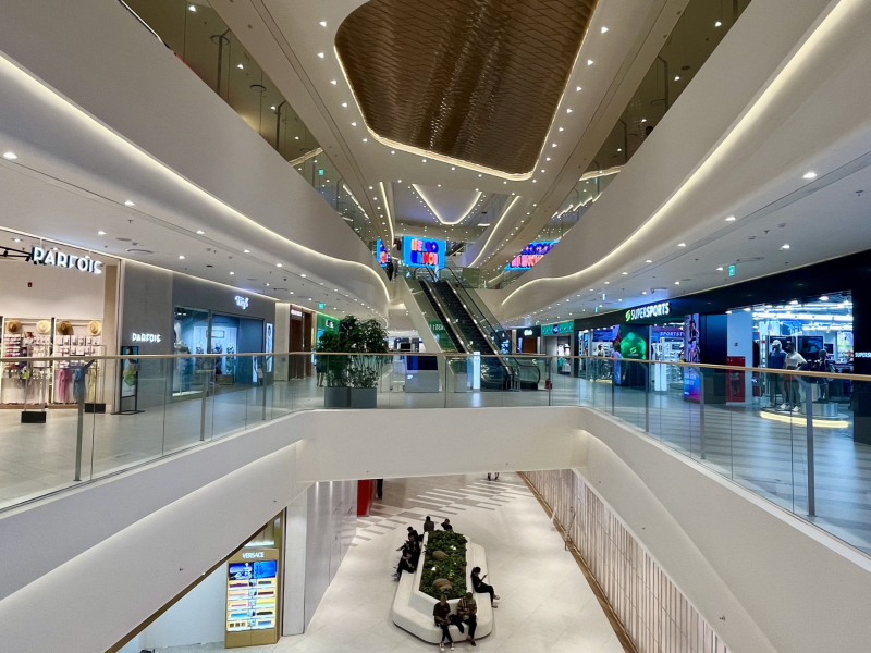 메인 보이드 공중에 연출한 이지연 작가의 설치 작품 '무지개 숲'은 나노패턴 기술을 활용해 자연 채광의 빛을 반사시켜 공간에 아름다움을 더하는 역할을 하고 있다. 이 밖에도 고객 동선 주변으로 설치된 12개의 대형 디지털 사이니지를 통해 다양한 미디어 아트를 감상할 수 있도록 했다.