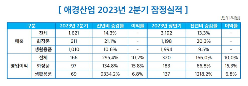 애경산업은 글로벌 사업 성장, 브랜드 포트폴리오 다각화, 국내외 디지털 채널 강화 등을 통해 매출과 이익이 개선되는 성과를 얻었다. 특히 이번 2분기와 상반기에 2020년 코로나19 발생 이후 분기 및 반기 최대 영업이익과 영업이익률을 달성하며 견조한 성장세를 이어가고 있다.