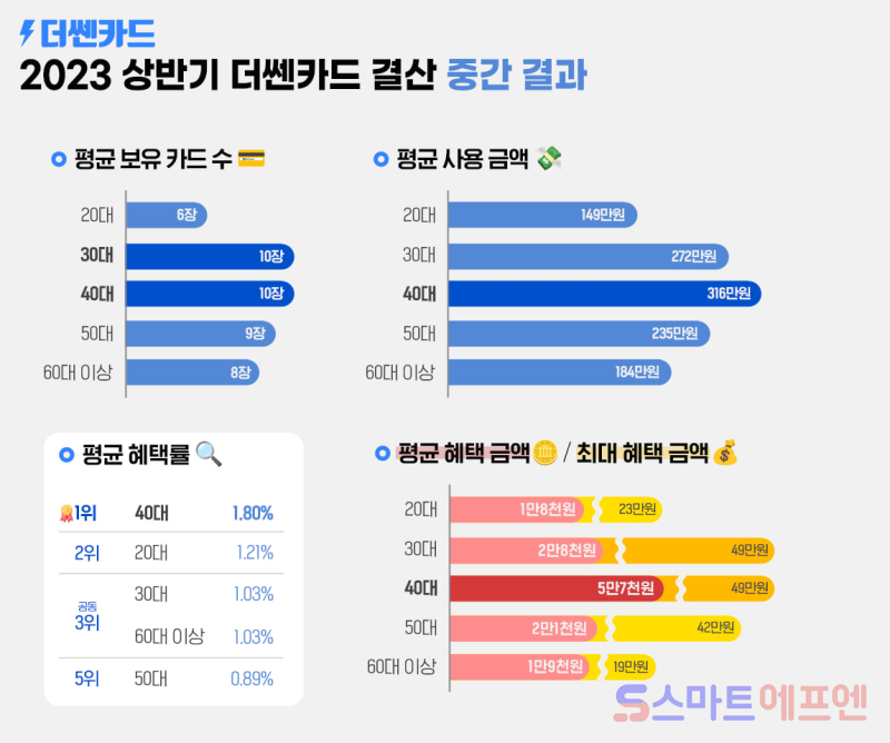 더쎈 카드 결산 서비스는 현재까지 9000여 건의 리뷰가 이어지고 있으며 약 5000건의 공유가 일어나는 등 인기를 끌고 있다. 더쎈카드 회원 40만 명의 실제 데이터를 바탕으로 집계한 결과 40대가 평균 혜택 금액 5만7000원에 평균 혜택률 1.8%로 카드 혜택을 가장 많이 받았다. 20대는 평균 사용 금액이 전 연령대에서 가장 낮아 혜택 금액은 1만8000원에 불과했지만 혜택률은 1.2%로 2위를 기록했다.