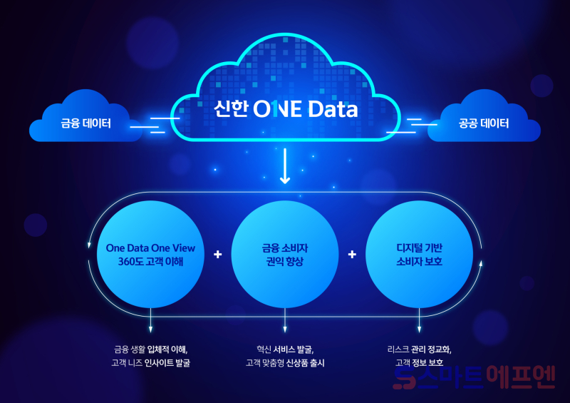‘신한 원 데이터’는 그룹의 데이터 경쟁력 제고 및 효율화를 목표로 은행, 카드, 증권, 라이프의 데이터를 표준화해 통합하고 사용자 맞춤형 분석 및 활용을 지원하는 데이터 플랫폼이다.