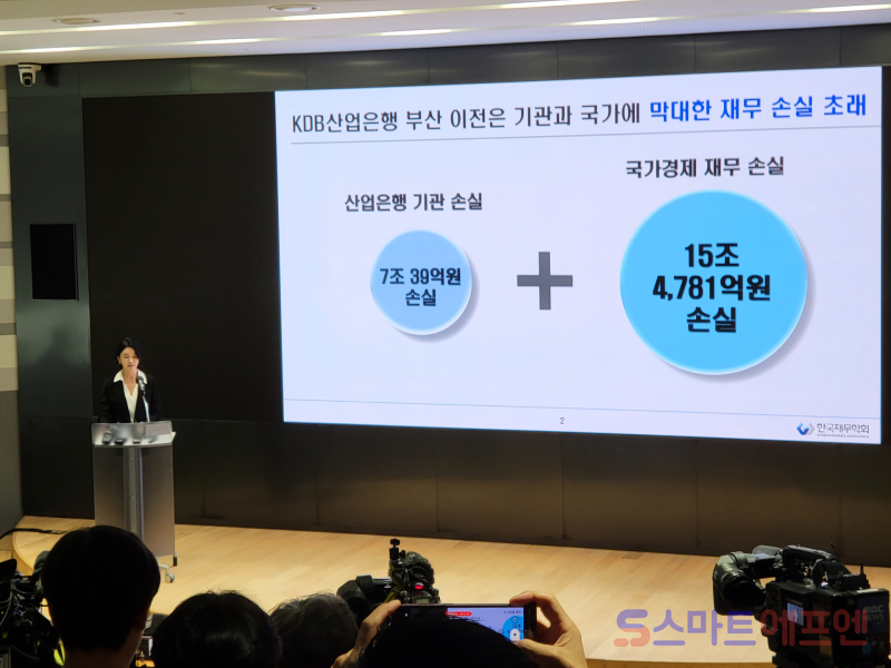 이날 발표에 나선 한국재무학회 측은 "산업은행 부산 이전 시, 10년에 걸쳐 기관 손실 7조39억원과 국가경제 재무 손실 15조4781억원의 누적 손실이 예상된다"고 밝혔다.