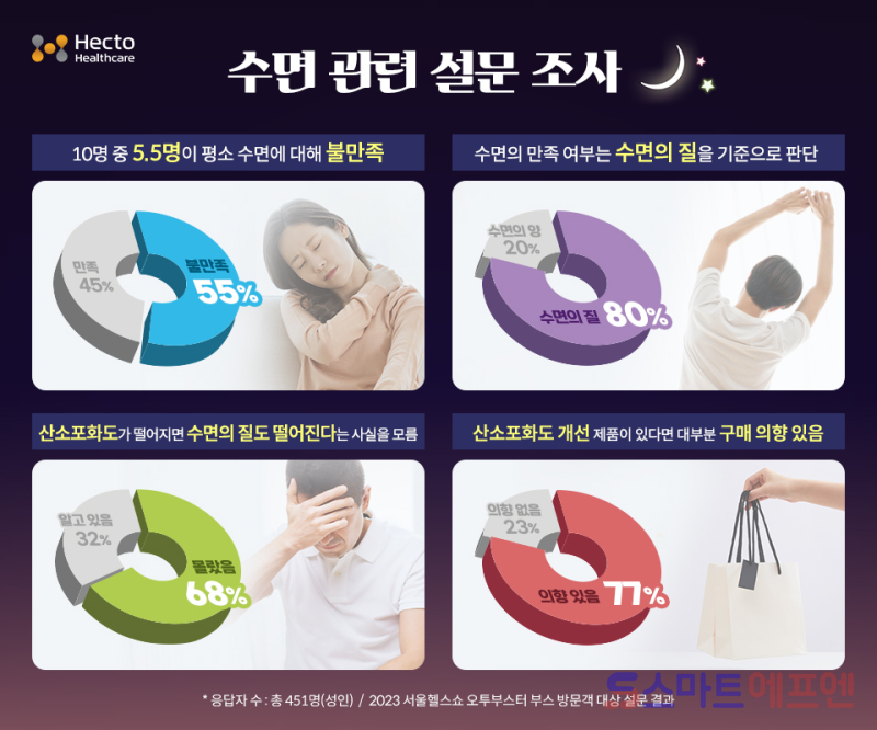 수면무호흡증으로 자는 동안 호흡이 멈추면 혈중 산소포화도가 감소해 숨을 쉬기 위해 잠에서 깨게 된다. 뿐만 아니라 정신신경학적 이상, 심폐혈관계 이상, 뇌혈관계 이상, 대사 장애 등의 원인이 되기도 한다. 일정 수준의 산소포화도 유지는 숙면의 조건 중 하나이지만 응답자 중 32.4%만이 중요성을 알고 있다고 답했다.