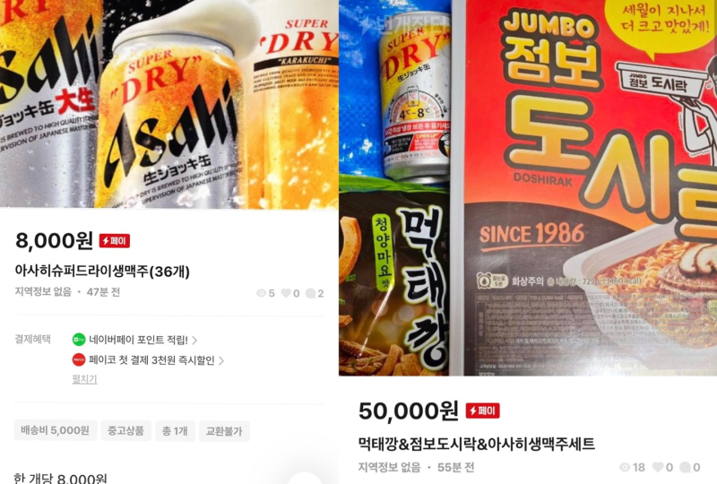 또, 한 중고 플랫폼에서는 현재 구매하기 힘든 먹태깡, 점보도시락, 아사히 수퍼드라이 생맥주캔을 묶어 5만원이라는 금액에 판매하기도 한다.