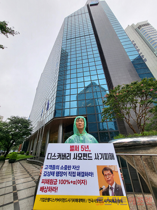 [스마트에프엔=권오철 기자] 14일 서울 중구 을지로 소재 IBK기업은행 본점 앞에서 기업은행디스커버리펀드사기피해대책위 관계자들이 이날 내린 폭우 중에도 우비를 입고 "고객들의 소중한 자산, 김성태 행장이 직접 해결하라" "한국투자증권 방식의 원금 전액과 5년간 이자까지 배상하라"고 외치고 있다. 사진=권오철 기자