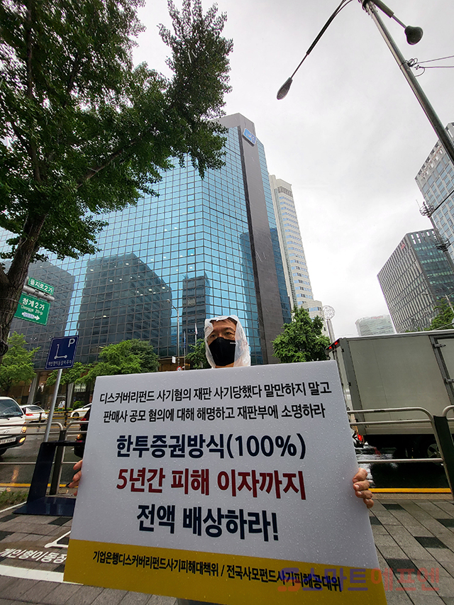 [스마트에프엔=권오철 기자] 14일 서울 중구 을지로 소재 IBK기업은행 본점 앞에서 기업은행디스커버리펀드사기피해대책위 관계자들이 이날 내린 폭우 중에도 우비를 입고 "고객들의 소중한 자산, 김성태 행장이 직접 해결하라" "한국투자증권 방식의 원금 전액과 5년간 이자까지 배상하라"고 외치고 있다. 사진=권오철 기자 권오철 기자 konplash@smartfn.co.kr 다른기사 키워드 #디스커버리펀드 #기업은행 #사기 #김성태 #은행장 관련기사 디스커버리펀드 피해대책委 “윤종원 은행장 사진 피켓 문제 삼고 음악도 틀지 말라는 기업은행” 디스커버리펀드 항소심 개시…피해자들 "1심 판결, 전면 뒤집어져야" 기업은행 디스커버리펀드 피해자들, ‘금감원 분조위 조정결정’ 거부 디스커버리펀드 피해자들, ‘착오에 의한 계약취소 결정’ 촉구 기자회견 열어 저작권자 © 스마트에프엔 무단전재 및 재배포 금지 개의 댓글 회원로그인 작성자 비밀번호 댓글 내용입력 댓글 정렬 최신순 추천순 답글순 BEST댓글 BEST 댓글 답글과 추천수를 합산하여 자동으로 노출됩니다. 닫기 더보기 댓글삭제 삭제한 댓글은 다시 복구할 수 없습니다. 그래도 삭제하시겠습니까? 비밀번호 댓글수정 댓글 수정은 작성 후 1분내에만 가능합니다. 본문 / 400 비밀번호 내 댓글 모음 닫기