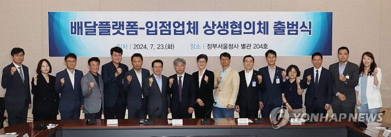 지난 7월 23일 서울 종로구 정부서울청사 별관에서 열린 배달플랫폼-입점업체 상생협의체 출범식에서 양측 참석자들이 기념사진을 촬영하고 있다. / 사진=연합뉴스