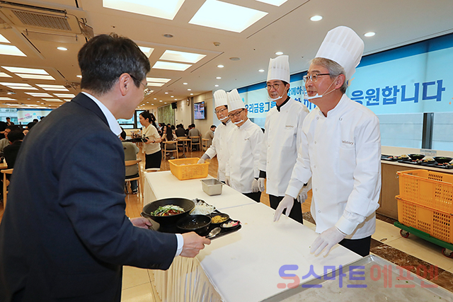 ‘우리가 함께 하는 특별한 한끼’라는 주제로 진행된 이날 행사에는 임 회장을 비롯해 이임하는 이원덕 우리은행장, 취임하는 조병규 은행장 내정자, 박봉수 노동조합 위원장도 함께 참여해 그 의미를 더했다. 배식을 마친 임 회장은 직원들과 함께 식사하며 편하게 담소를 나눴다.
