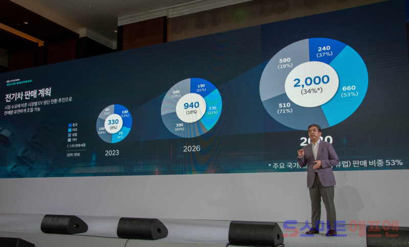 현대차는 제네시스를 포함해 글로벌 전기차 판매목표를 제시했다. 올해 33만대 판매 계획을 넘어 2026년 94만대, 2030년 200만대로 전기차 판매 규모를 키우겠다는 목표를 수립했다. 현대차는 글로벌 전기차 판매규모를 3년내로 3배 수준, 7년 내로는 6배 이상의 규모로 확대하는 방침이다. 작년 CEO 인베스터 데이 발표 대비 2026년과, 2030년의 EV판매 목표는 각각 10만대, 13만대씩 상향됐다.
